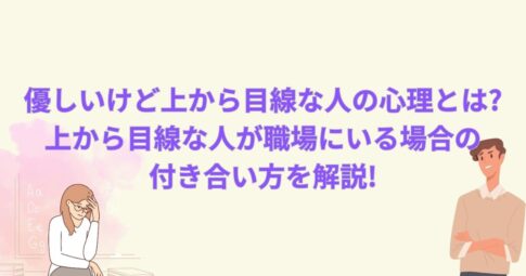 メンタルヘルス今回は、優しいけど上から目線な人の心理や職場での上から目線の人の特徴、そして上から目線な人との付き合い方について解説します。 こんなお悩みありませんか? 毎日関わる人が、上から目線で話をする人だと疲れてしまいますよね。 ...